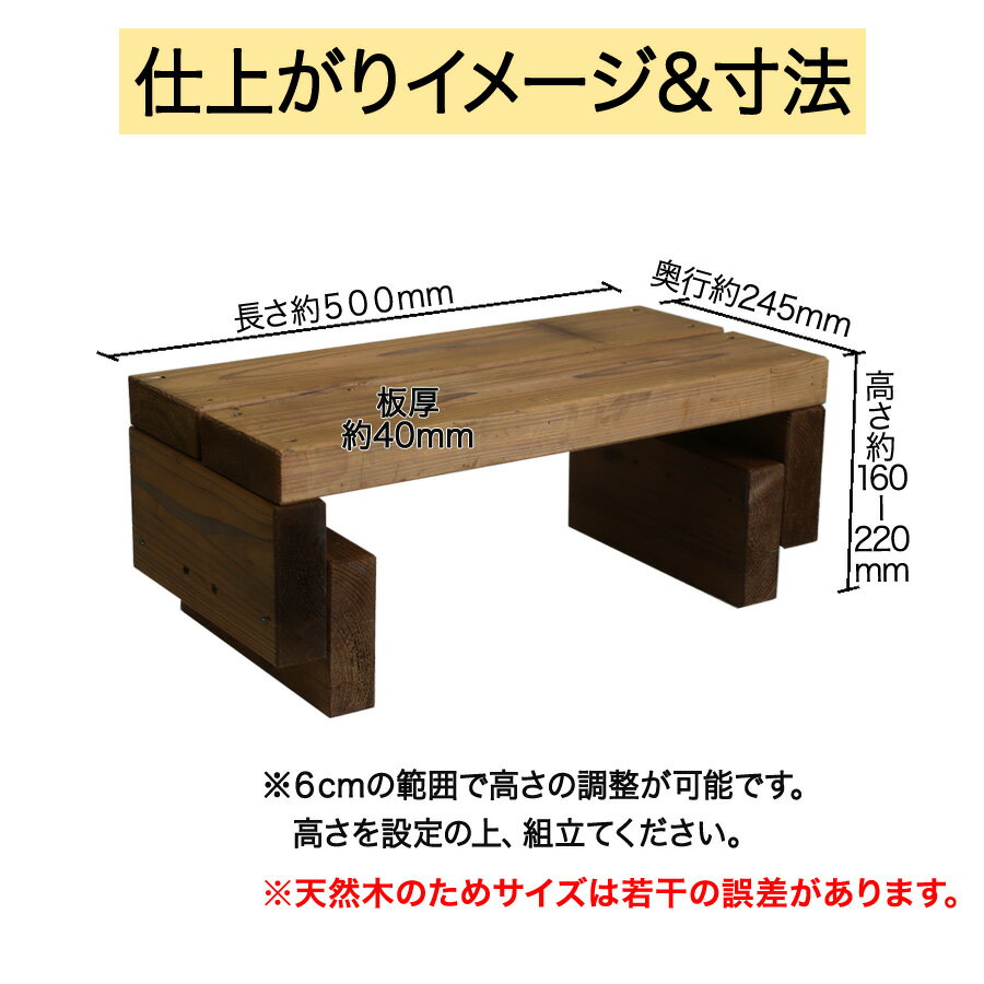 樹種 国産杉材 サイズ 幅約500×奥行約245×高さ約160〜220(単位:mm) (6cmの範囲で高さ調整が可能です) 梱包内容 天板2枚:約500×120×40 受材2枚:約245×120×40 脚材2枚:約245×120×40 ※木材は下穴加工が可能です。